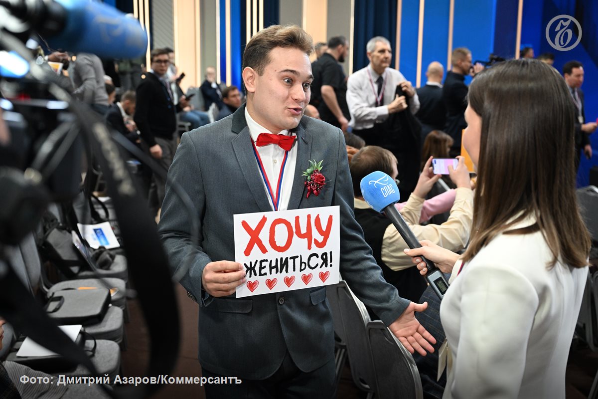 Корреспондент из Екатеринбурга Кирилл Бажанов с табличкой «Хочу жениться» сделал предложение своей девушке на прямой линии президента.