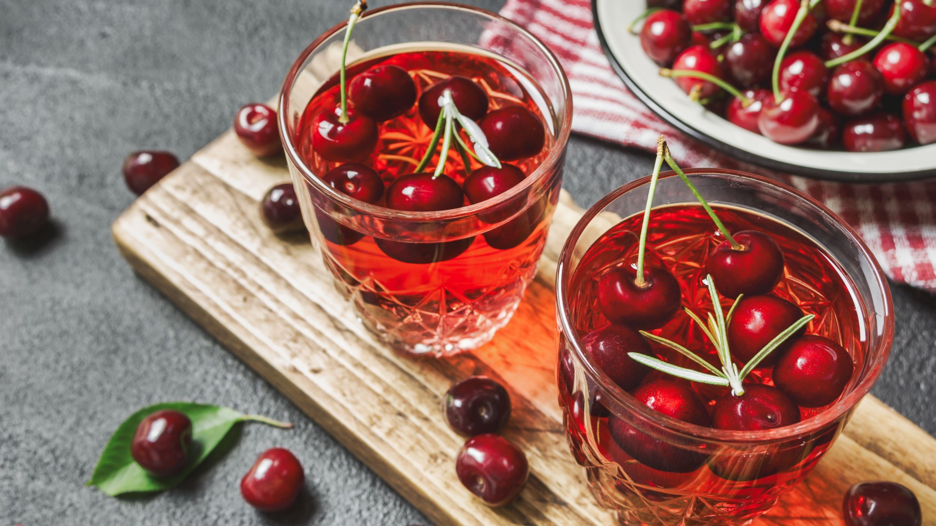Сок вишни нагрейте на слабом огне, не доводя до кипения. Перелейте его в подготовленный бокал с толстыми стенками, а затем влейте оставшиеся компоненты.