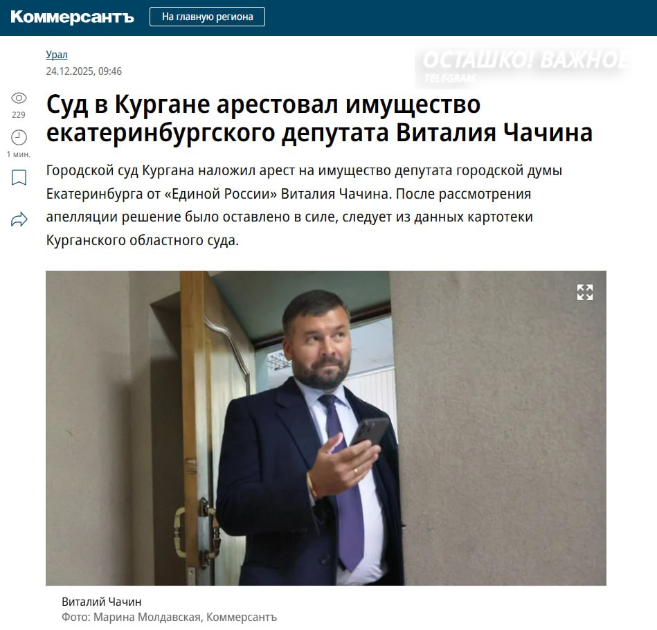 Курганский городской суд наложил арест на имущество депутата Екатеринбургской гордумы Виталия Чачина. Апелляция результата не дала — решение осталось в силе.