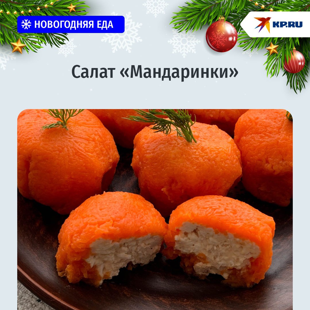 Салат "Мандаринки"Вареные яйца, картофель, сыр натертые на мелкой терке, вместе с нарезанным кубиками вареным куриным филе заправляете майонезом, в такой консистенции, чтобы потом скатать из салата шарики. Мелко натертую вареную морковь рассыпьте на пищевой пленке ровным слоем, в центр положите шарик и оберните его слоем моркови. Один мандарин готов! Можно добавить листик зеленого базилика – будет очень похоже на фрукт.