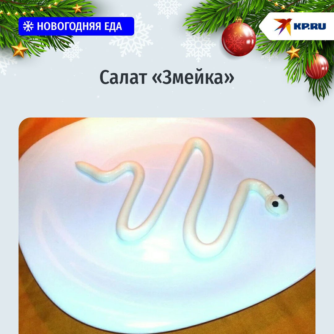 Салат "Змейка"Нарисуйте на тарелке майонезом или любым другим соусом змейку, из двух горошин черного перца сделайте глазки. Проводить уходящий год Змеи таким студенческим салатом вполне можно, но, чтобы едоки все же перекусили, добавьте на тарелку котлету, куриную ножку или мясо.