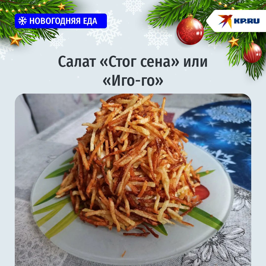 Салат "Стог сена" или "Иго-го!"Мелко нарезанное отварное куриное филе смешайте с натертыми на крупной терке сыром, вареными яйцами и мелко нарезанными огурцами и зеленым луком. Заправьте майонезом. Картофелем в виде мелкой соломки, обжаренный до корочки, украшайте горку из салата до тех пор, пока не станет похоже на стожок сена. Или муравейник. Картошку добавляйте в самый последний момент, перед едой, чтобы не размокла.