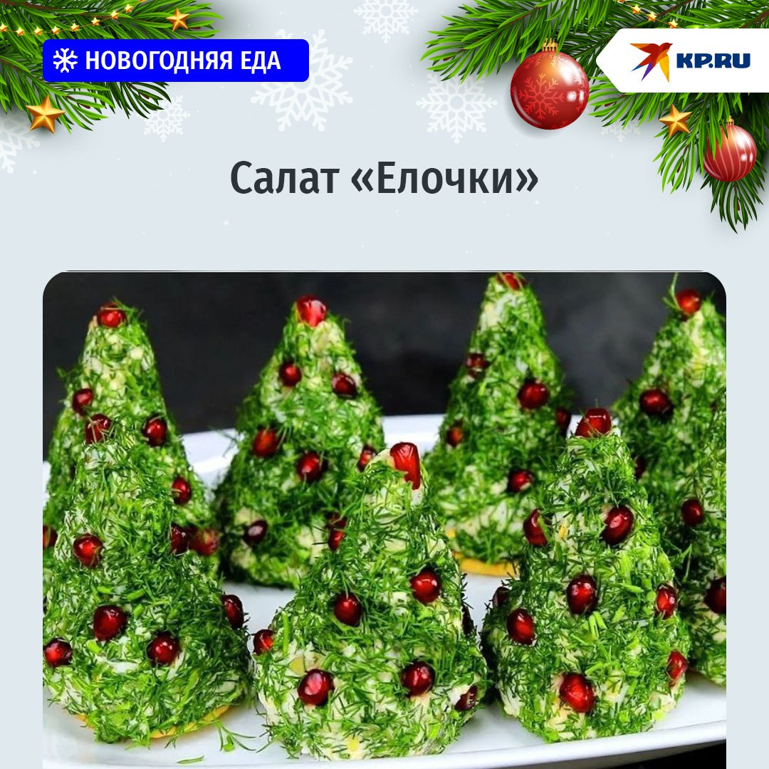 Салат "Елочки"Берете любой готовый салат вроде оливьешки, крабового, или иного другого достаточно однородного, чтобы ему можно было придать форму пирамидки. Украшаете зеленью, например укропом, но и петрушка пойдет. В качестве «елочных игрушек» можно использовать зерна граната, но, если не хотите возиться потом с косточками, можно использовать вареные кукурузу и горох.