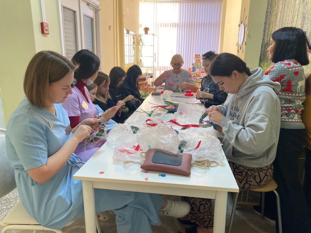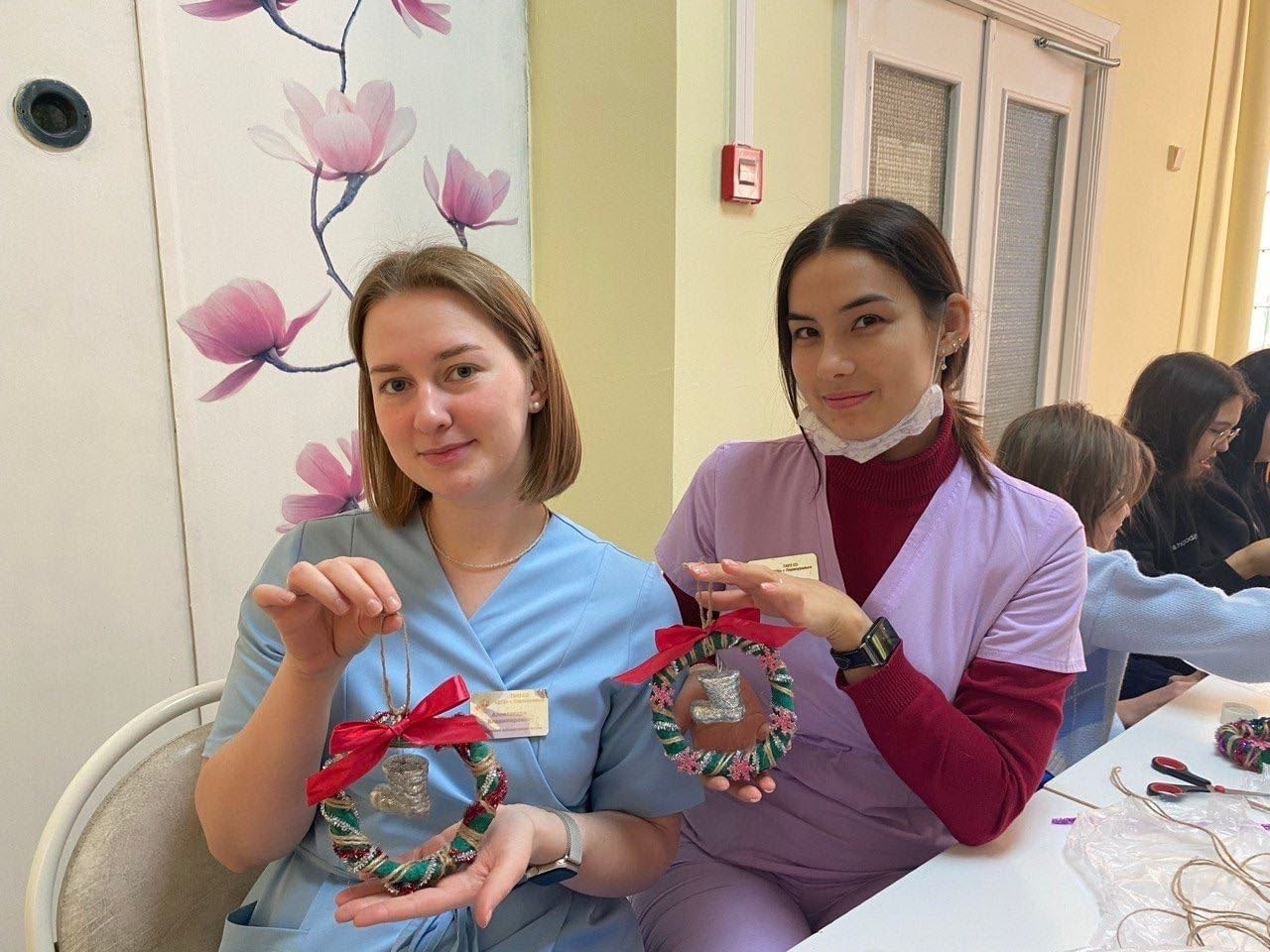 Главный мастер на «Фабрике Деда Мороза» — педагог центра Ирина Зорина. Она давно и плодотворно сотрудничает с детской больницей Первоуральска. Помощниками мастера на «Фабрике Деда Мороза» в один из дней работали члены профкома больницы: Александра Ярина и Лилия Хузина.