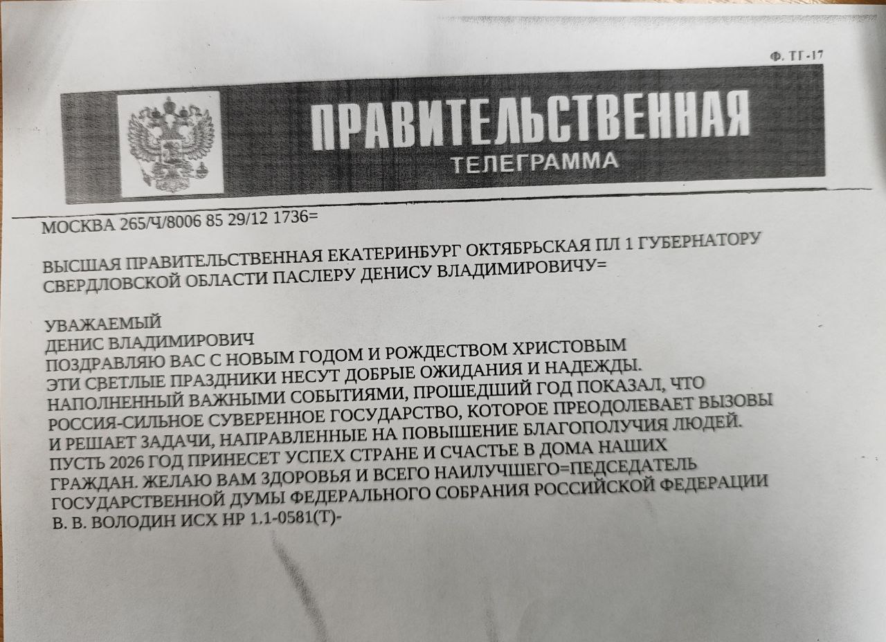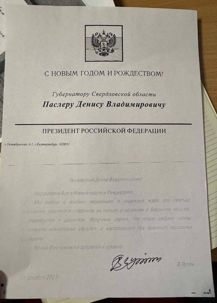 Президент России Владимир Путин поздравил губернатора Дениса Паслера и всех свердловчан с Новым 2026 годом и Рождеством
