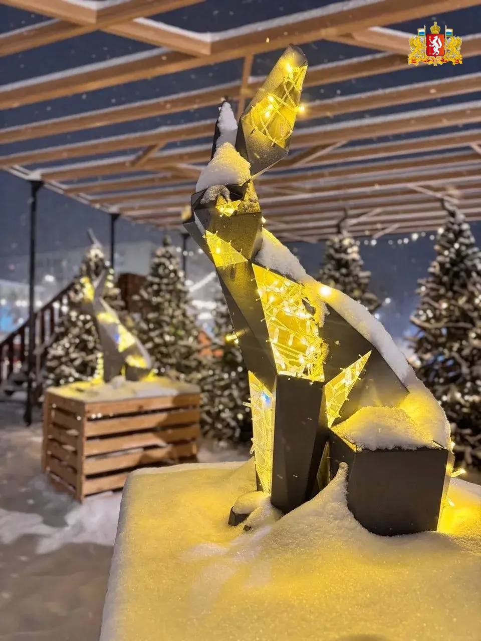 Главная площадка – пространство на Тропе здоровья. Здесь установлена новогодняя ель, украшенная светодиодным куполом, качели-кольца, группы маленьких елочек, впервые смонтированы полигональные фигуры.