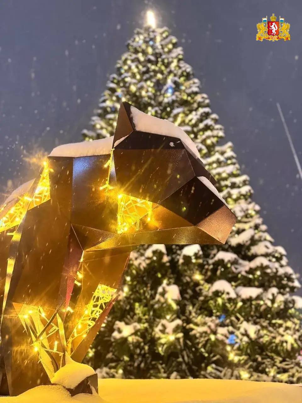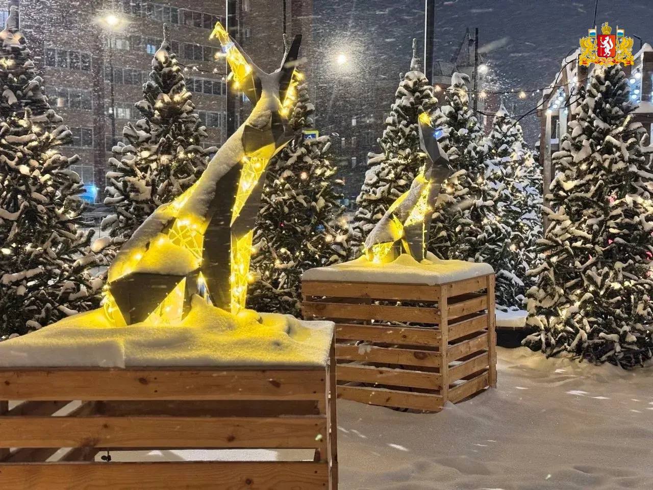 На Торговой площади оформлено новогоднее пространство с украшенной елкой и фигурами Деда Мороза и Снегурочки