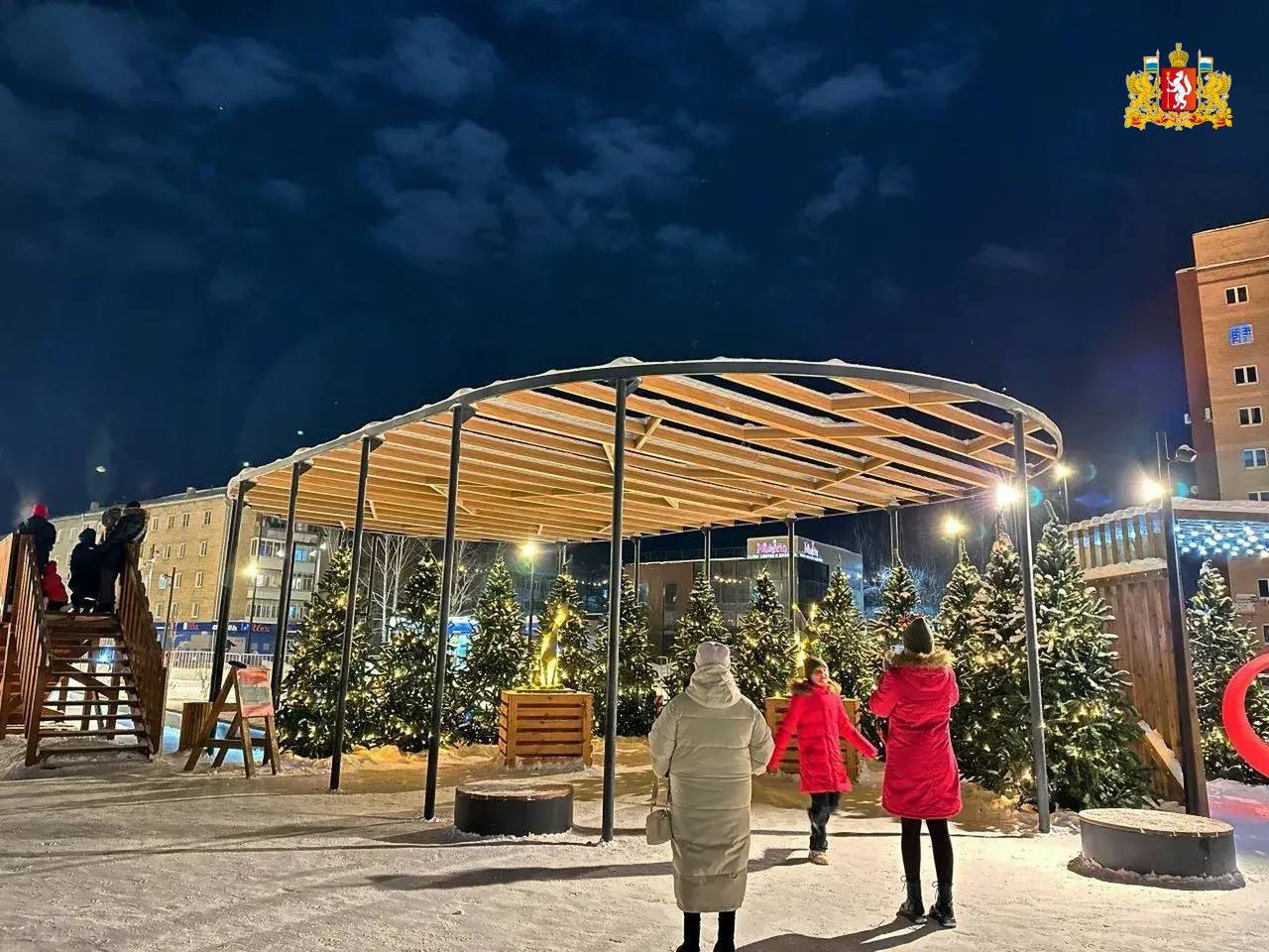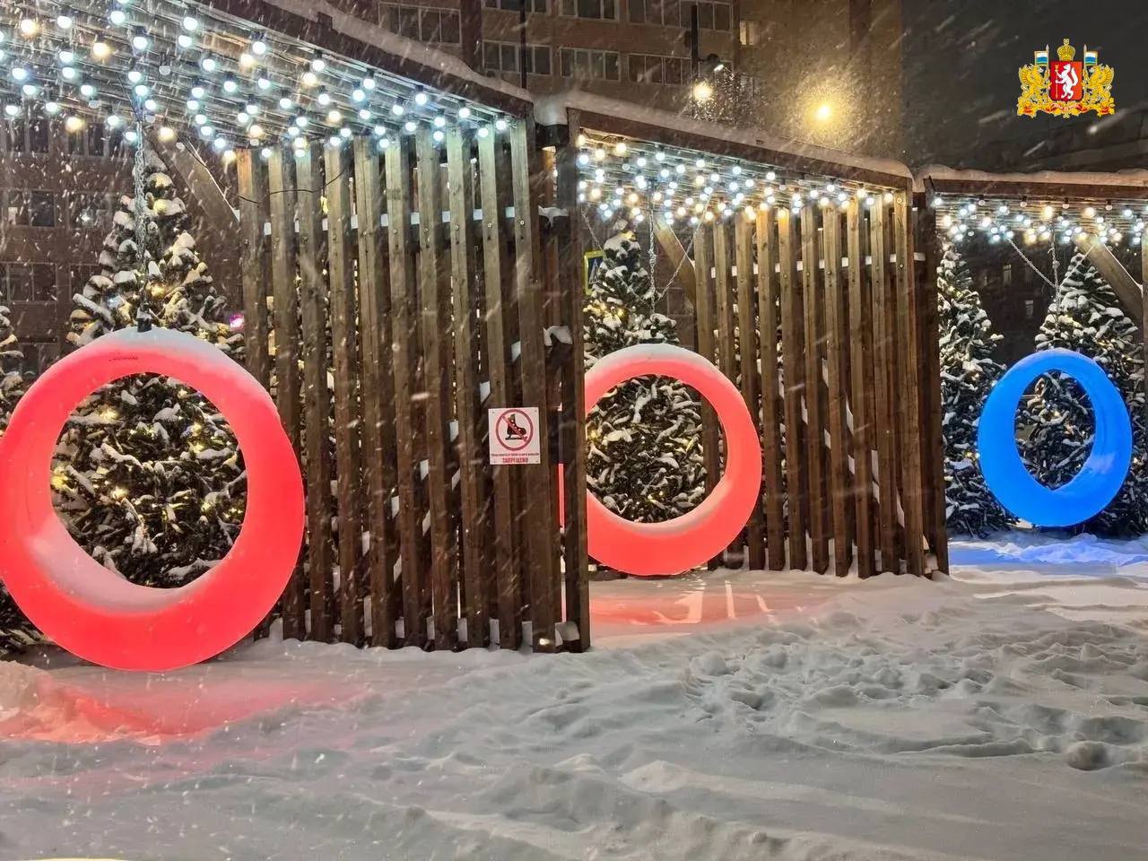 В этом году появилась новая праздничная локация, в Новоберезовском, здесь установили елку и светодиодные качели-кольца.