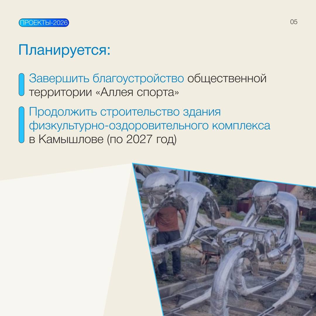 В 2026 году в Камышлове планируется капитальный ремонт тепловых сетей в центральной части города и от газовой котельной по улице Строителей, капитальный ремонт сети водоотведения по улице Боровой, строительство теплосети для подключения физкультурно-оздоровительного комплекса, капитальный ремонт и оснащение детского сада № 12, капитальный ремонт спортзала спортивной школы по улице Свердлова, 92а, завершение благоустройства общественной территории «Аллея спорта», а также продолжение строительства здания физкультурно-оздоровительного комплекса до 2027 года.