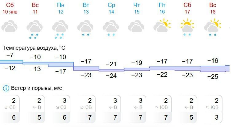 Новогодние каникулы почти закончились, но первая рабочая неделя года не спешит радовать погодой. Днем температура воздуха упадет с -7°С до -17°С во вторник, а самым холодным днем недели станет среда — тогда похолодает до -21°сднем.