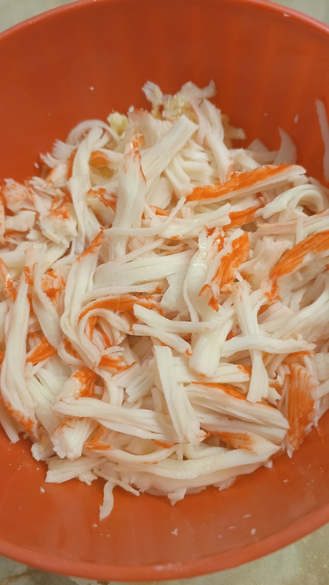 - 200 грамм крабовых палочек «Снежный краб», которые легко разделяются на волокна;