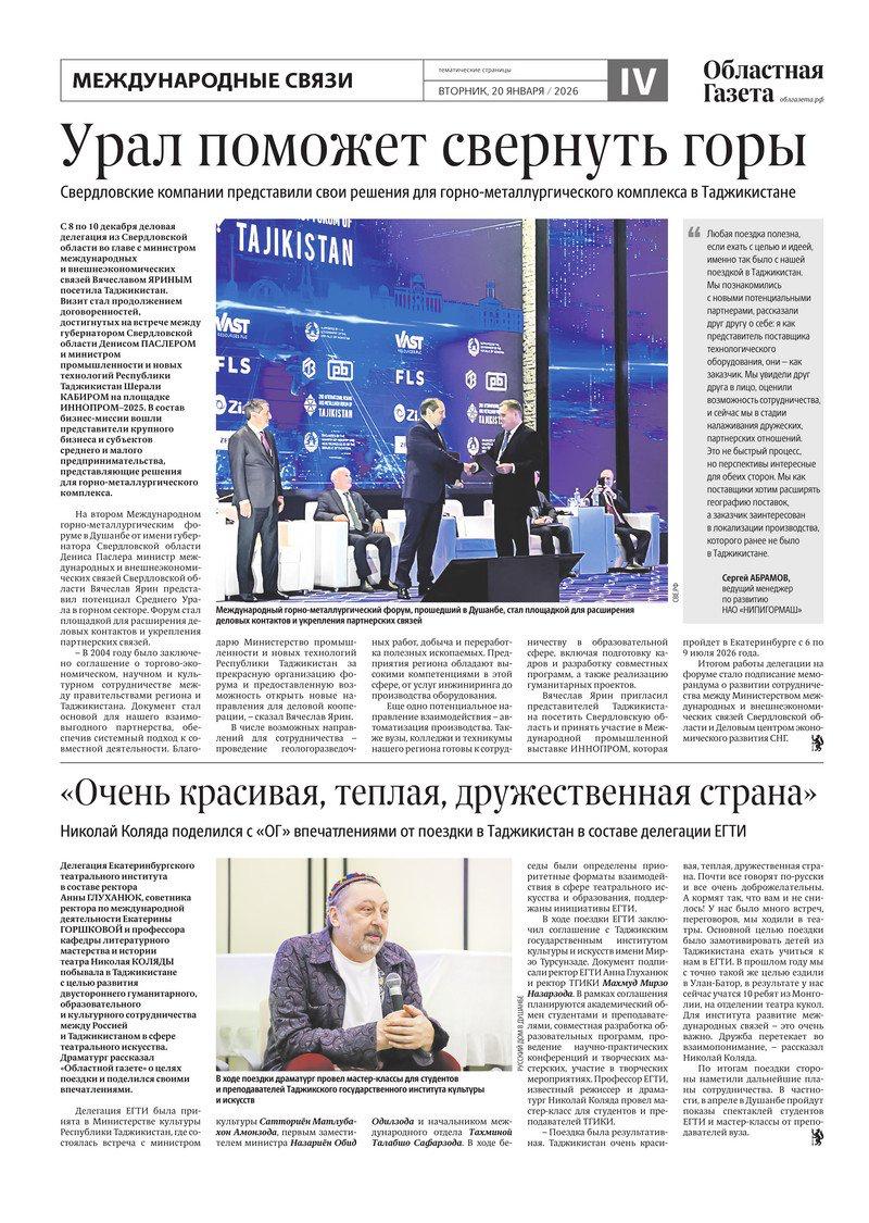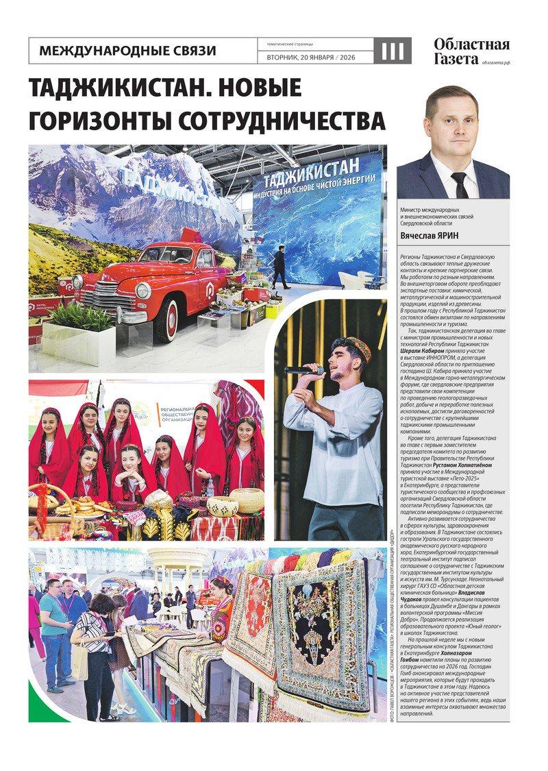 Таджикистан. Новые горизонты сотрудничества: министр международных и внешнеэкономических связей региона Вячеслав Ярин – о развитии двустороннего сотрудничества между Средним Уралом и Республикой Таджикистан