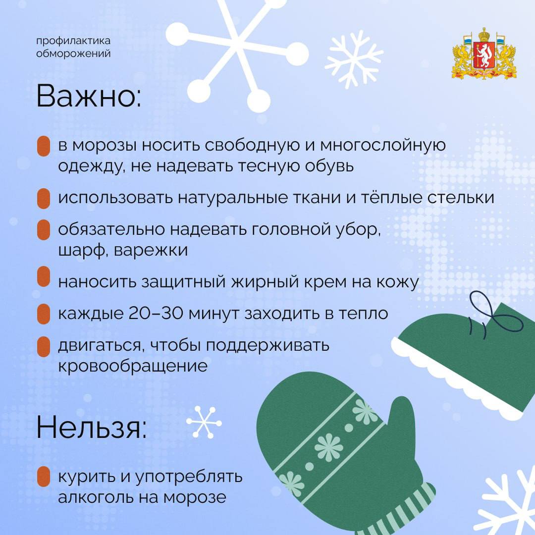 На этой неделе на Средний Урал пришли настоящие морозы. «Областная газета» напоминает об основных правилах безопасности в холодаОдевайтесь теплее и следите за тем, как одеваются ваши дети.Носите свободную одежду и обувь, меховые варежки.Лицо...