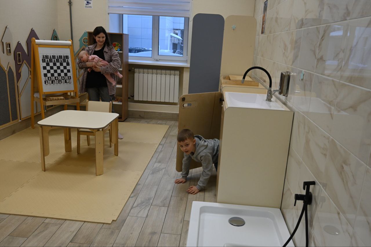 В комнате матери и ребёнка установлено кресло для кормления, ширма, пеленальный столик, модуль для гигиенических процедур и кулер. Для детей и родителей предусмотрено место для хранения верхней одежды и личных вещей, игровая зона для детей, манеж, игровые развивающие наборы и детский мольберт. Здесь же установлен модуль для приготовления детского питания, микроволновая печь и набор посуды.