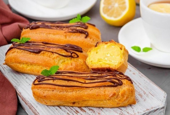 Разогрейте духовку до 220 градусов. Выложите тесто на противень и выпекайте эклеры 30-40 минут. После выпекания дайте им остыть и сделайте небольшие отверстия для начинки. Наполните эклеры тыквенным кремом и при желании украсьте растопленным шоколадом. Угощение готово, приятного аппетита!