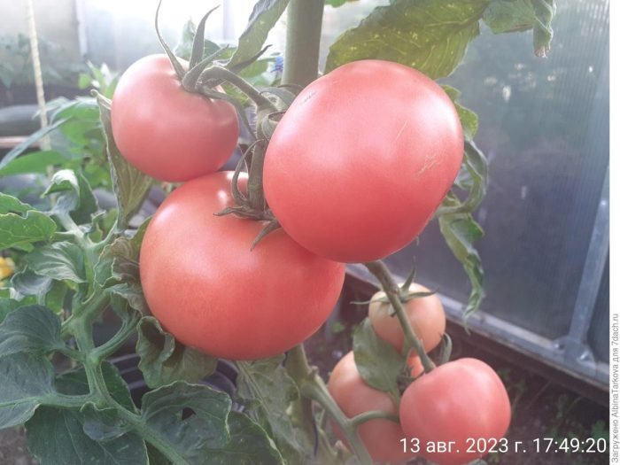 Индетерминантный рост требует опоры и аккуратного формирования. Плоды крупные, массой 250–350 г, ровные и плотные, розовые внутри и с тонкой кожицей, что важно для вкуса и легкости хранения. При нарушении полива могут возникнуть трещины, поэтому режим влажности важен на всех стадиях.