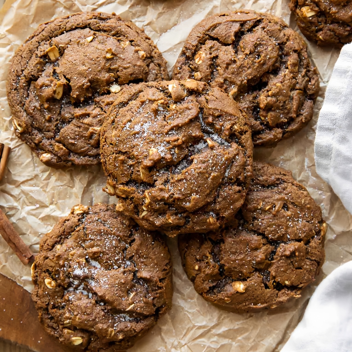 В основе – нежная масляная база с карамельной ноткой от темного сахара и тёплыми специями. Сухие и жидкие ингредиенты соединяются так, чтобы тесто сохраняло мягкость внутри и не трескалось снаружи. Небольшой холод в холодильнике возвращает структуру и позволяет печенью хорошо расплываться во время выпечки.