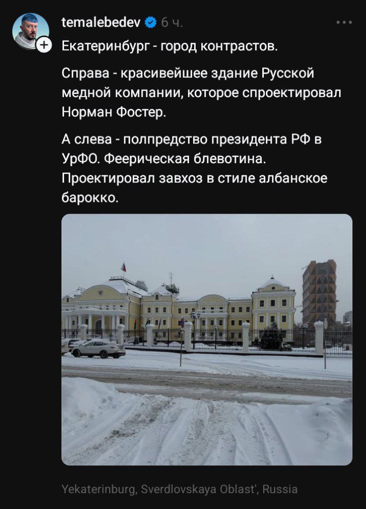 Он назвал столицу Урала городом контрастов, похвалив здание Русской медной компании, которое спроектировал Норман Фостер и раскритиковав здание полпредства.