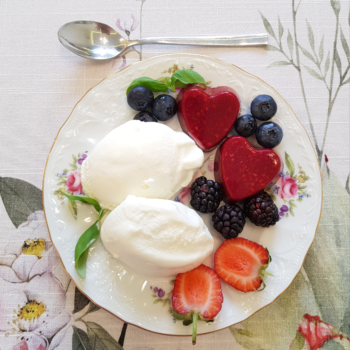 Подача: Выньте готовое желе из форм, разложите его на тарелках вместе с порцией мороженого, дополните свежими ягодами, такими как клубника, ежевика, голубика, и украсьте листиками базилика.