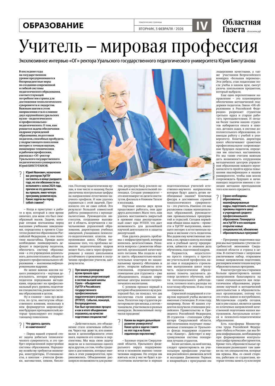 Учитель – мировая профессия: эксклюзивное интервью ректора Уральского государственного педагогического университета Юрия Биктуганова
