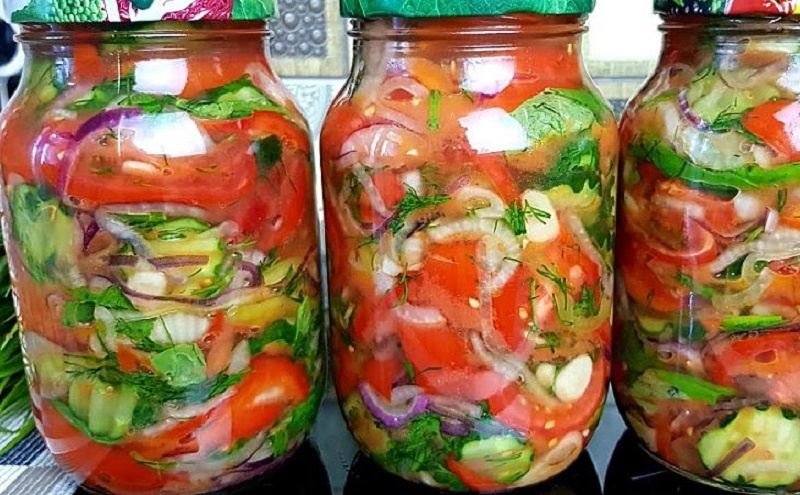 Теперь можно перейти к пошаговому рецепту: сначала нарезать овощи, перемешать их с солью и маслом, оставить на час, а затем распределить по стерилизованным банкам. Важный момент: уксус и сахар добавляют в каждую банку для лучшего консервационного эффекта.