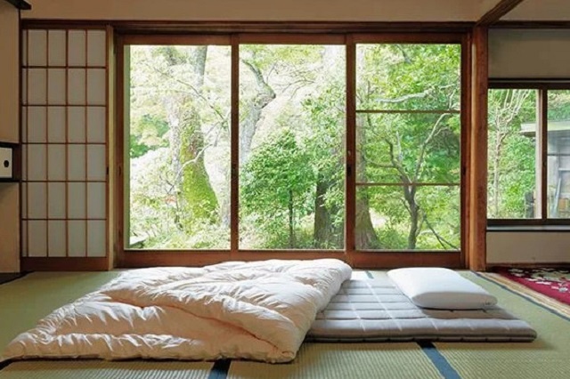 Японцы рассматривают отдых как процесс, который требует подготовки. Главное здесь — минимализм. Пространство свободно от излишеств. Вместо привычной кровати часто используется низкий футон, который утром легко убрать.