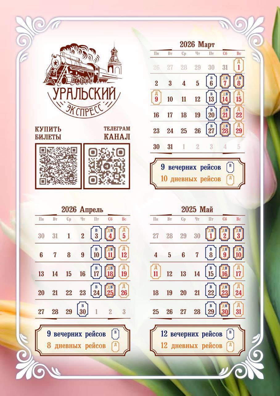 В праздничные дни 23 февраля и 8 марта «Уральский экспресс» также совершит и дневной, и вечерний рейс.