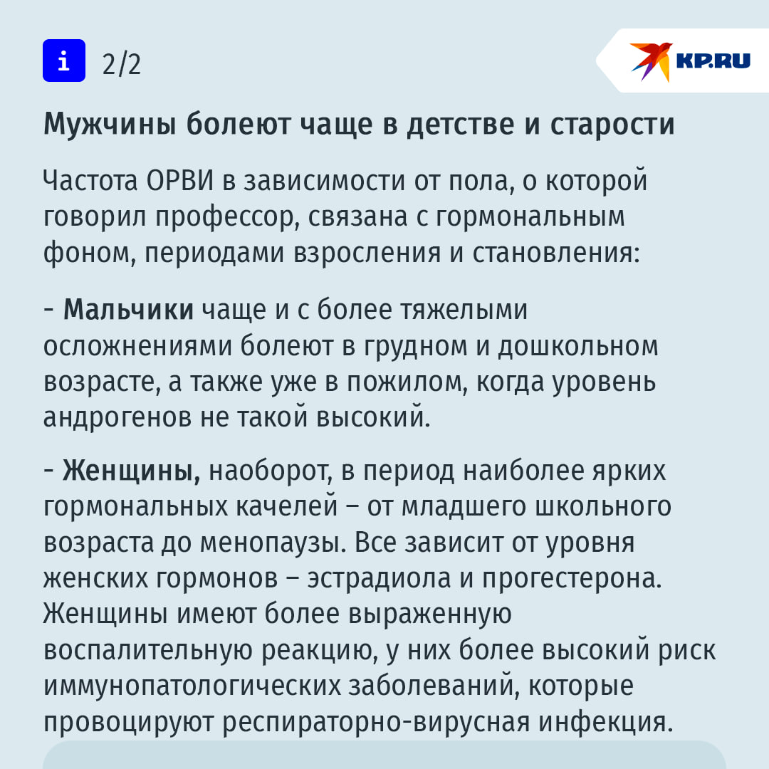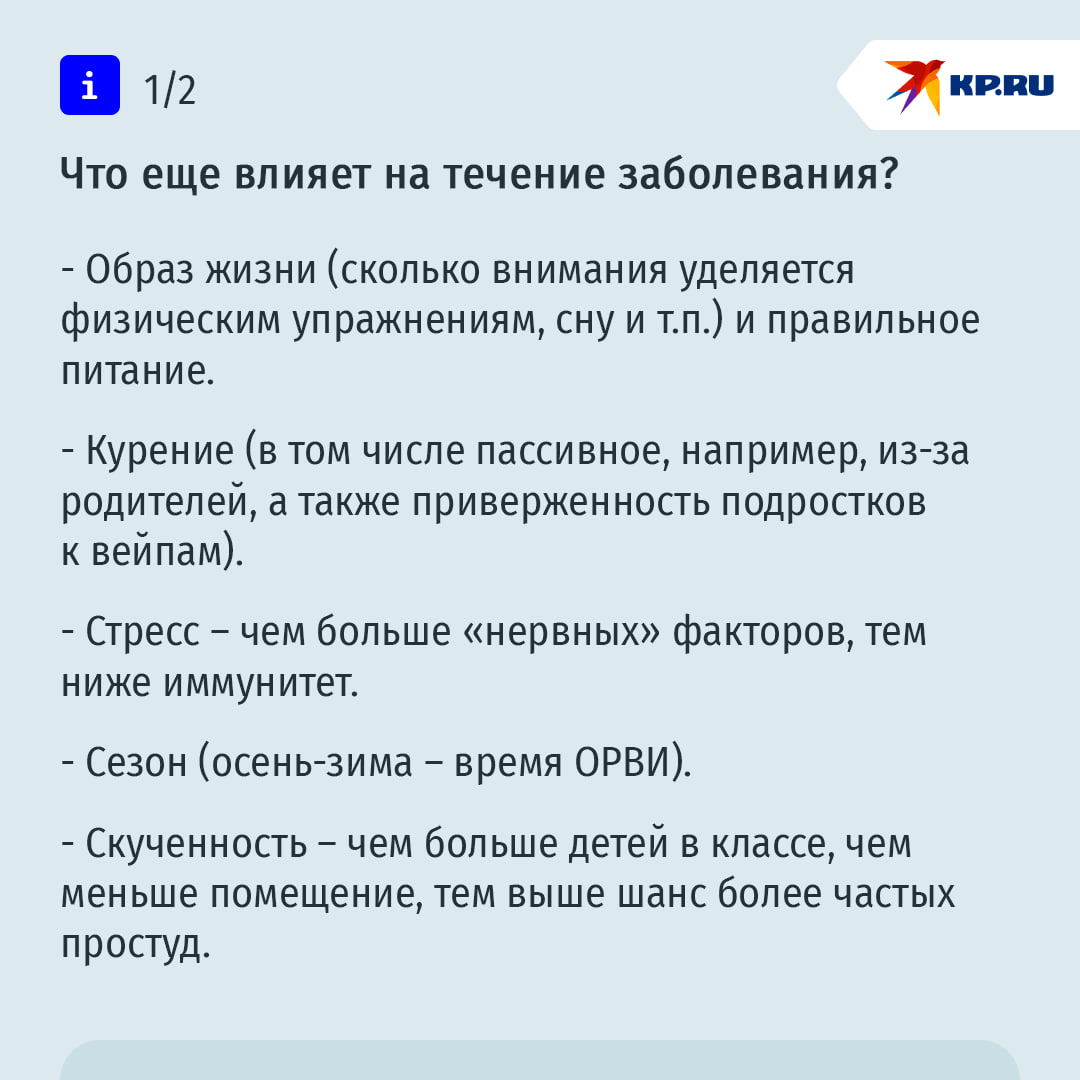 По словам доктора медицинских наук Геннадия Новикова, 90% случаев простуд у детей связаны именно с вирусами, и 50% из них — это риновирусная инфекция. Она, как и другие вирусные заболевания, может развиваться по принципу "айсберга", где в основании лежат отсутствие симптомов (хотя человек является носителем инфекции), или их очень слабая выраженность. А вот течение болезни завит от очень многих факторов, в том числе от пола, возраста (детсадовцы болеют чаще школьников) и иммунного статуса. А еще есть несколько исследований, которые доказывают, что переохлаждение реально связано с более частыми простудами: