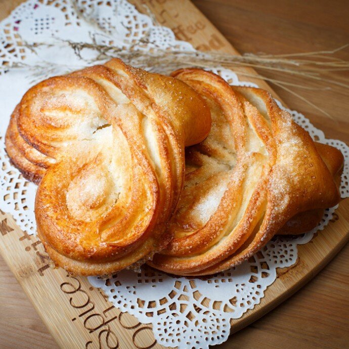 Сложите края теста внахлест, снова смажьте маслом и посыпьте сахаром. Затем сложите тесто пополам и аккуратно надрежьте одну сторону, раскрывая края так, чтобы они напоминали сердечко.