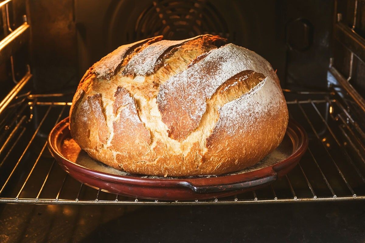 Нагрейте духовку до 230°C, выпекайте 30 минут, используя «купол» для лучшего результата.