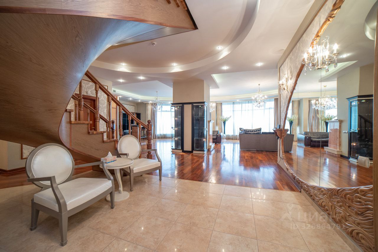 Двухуровневые апартаменты расположены в ЖК «Тихвин» в центре города. Площадь — почти 430 кв. м, включая собственную террасу на 60 «квадратов».