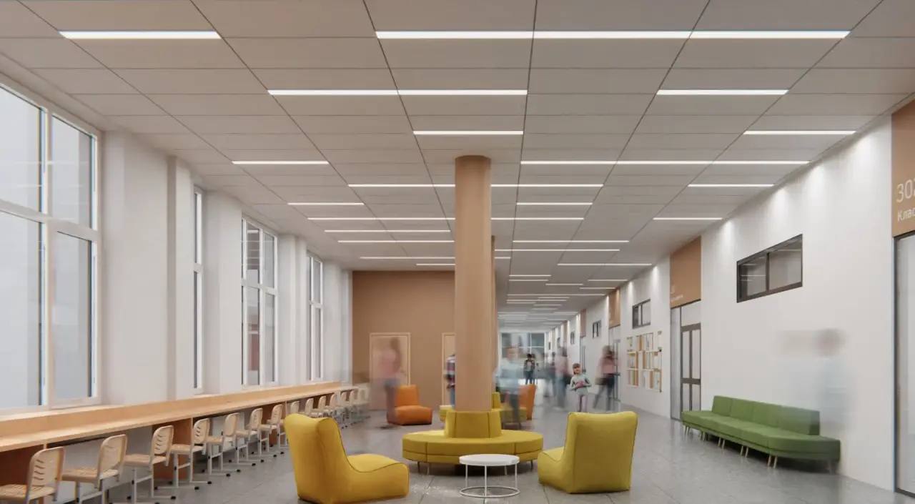 Как и в других современных школах города, в новом учебном заведении запроектированы коворкинги, а также пространства для проектной работы, отдыха и общения.