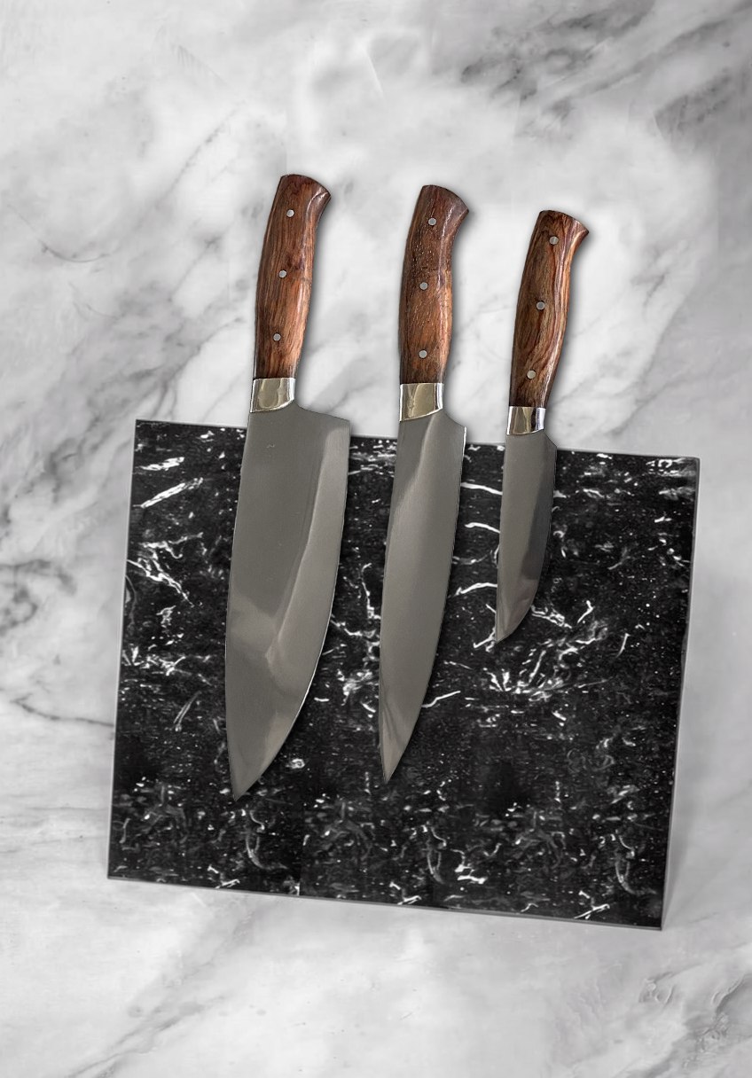 Получил ножи и сразу обратил внимание на рукоять — дерево просто живое на ощупь! Видно, что обрабатывали вручную: каждая неровность, каждый изгиб словно подчёркивают природную текстуру. В работе он оказался таким же душевным: шефнож режет мясо легко, будто скользит по воздуху. Спасибо за настоящую ручную работу!