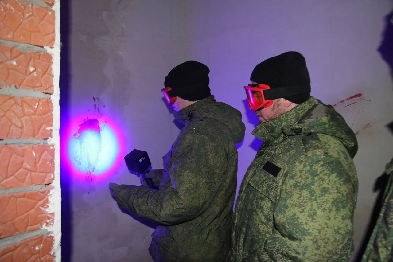 Третьи, находясь в неосвещённых помещениях многоэтажного здания, с применением источников криминалистического света обнаруживали следы крови на импровизированном месте убийства.