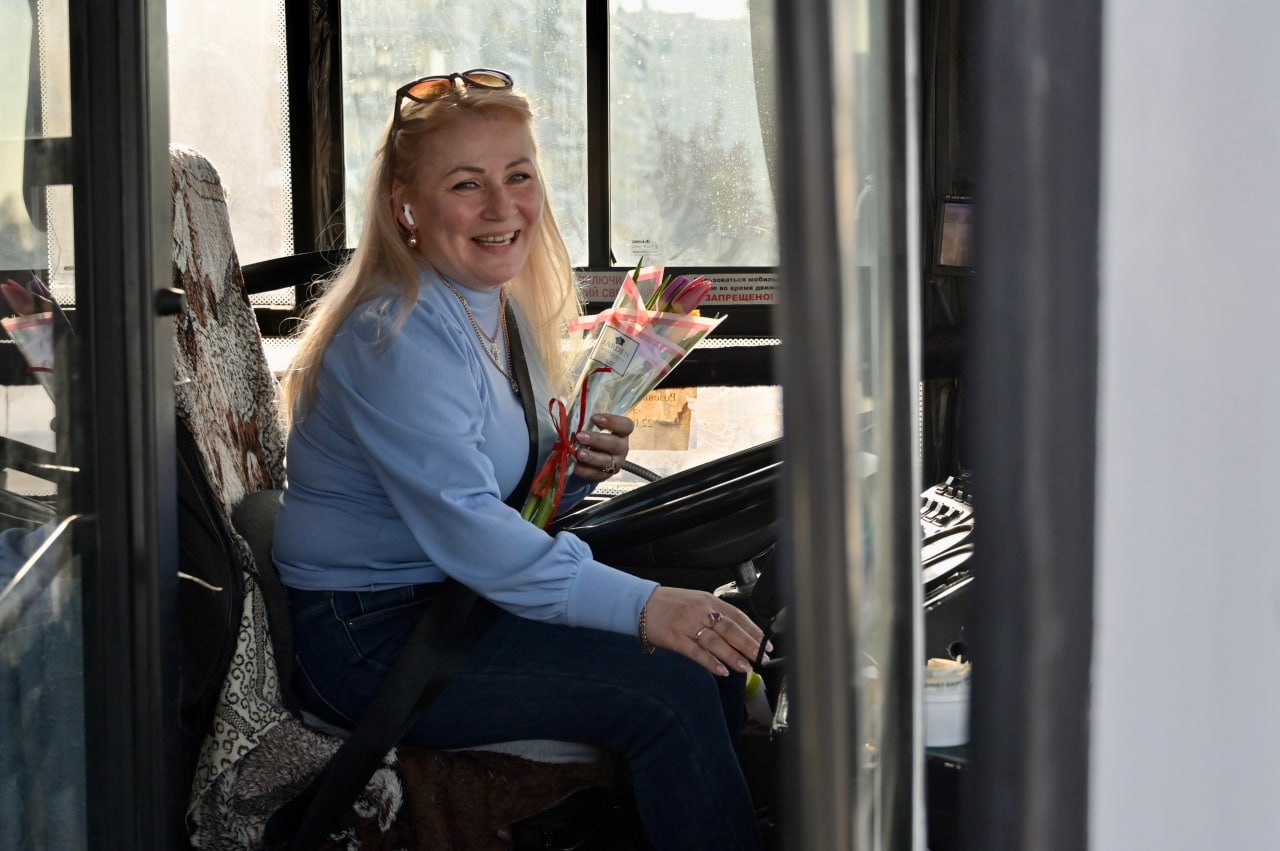 Поздравления принимали не только дамы на легковых автомобилях. Сотрудники Госавтоинспекции также останавливали автобусы и трамваи, чтобы вручить цветы женщинам, которые управляют общественным транспортом.