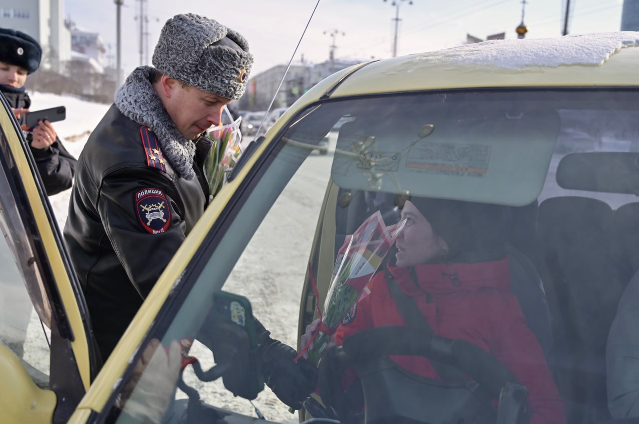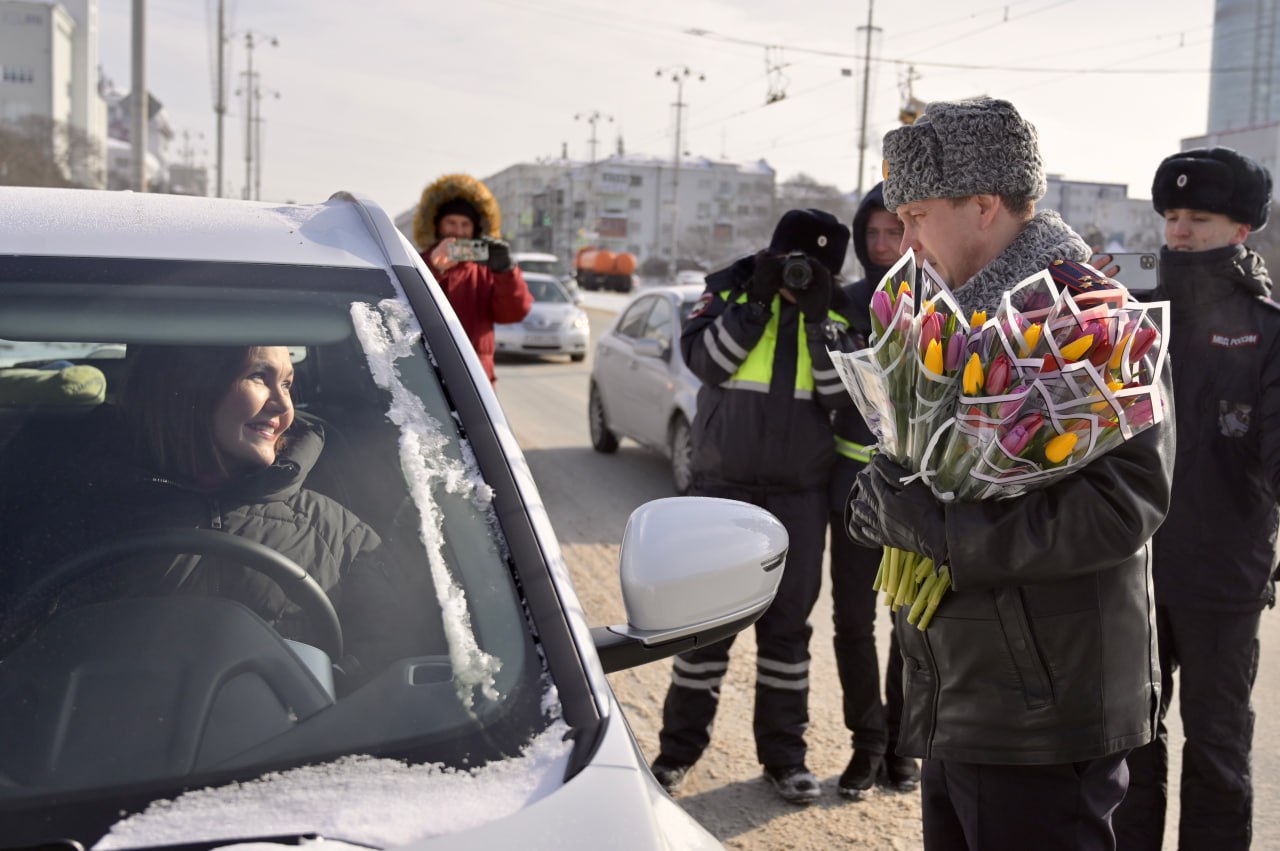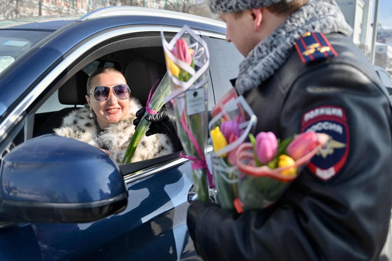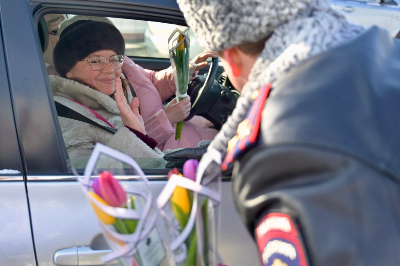 В этот день инспекторы ДПС останавливали автомобили, за рулем которых находились женщины. Автоледи ждал приятный сюрприз – цветы, поздравления и пожелания безопасной дороги.