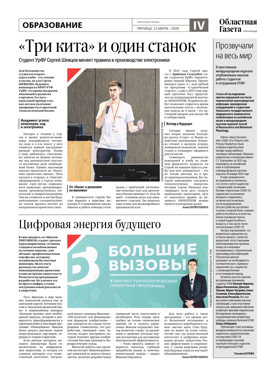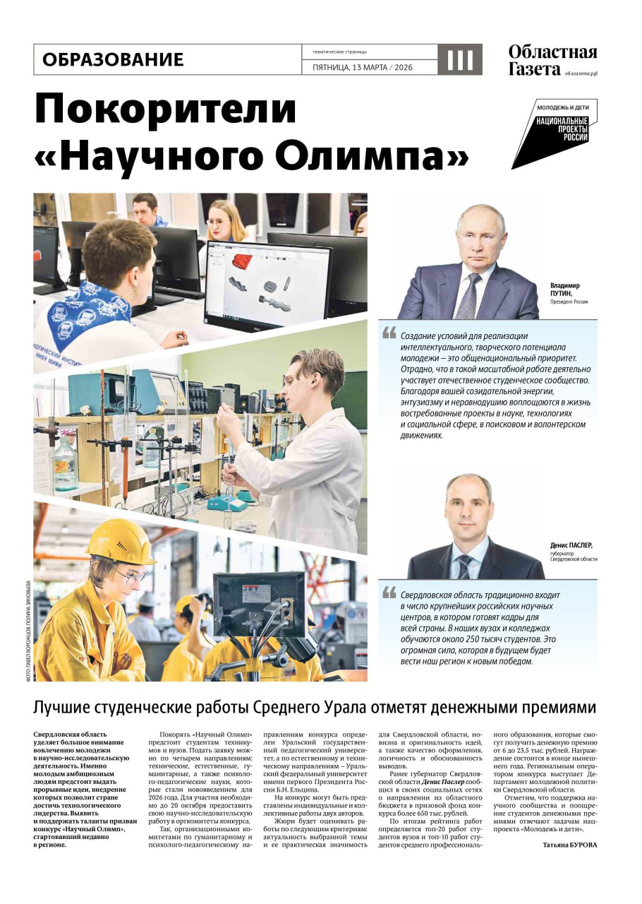 Сегодня в новом номере «Областной газеты» вышли тематические страницы, посвященные научно-исследовательской деятельности свердловских студентов