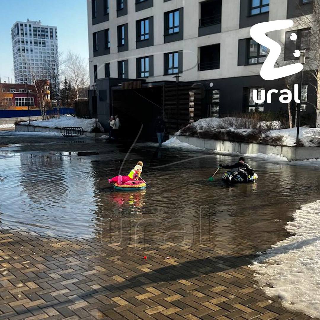 В гигантской луже посреди двора уже чилит малышня на бубликах, не хватает только коктейлей в руках.