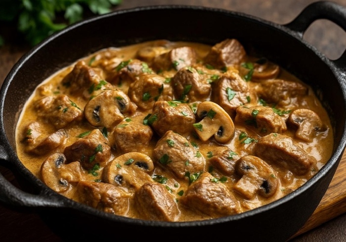 Сегодня в меню — вкусное и сытное блюдо, которое идеально согреет в холодный вечер и оставит после себя незабываемые вкусовые впечатления. Представьте сочную свинину, томящуюся с ароматными грибочками и сливочной сметанкой на вашей любимой сковороде – это удивительное сочетание не оставит никого равнодушным!
