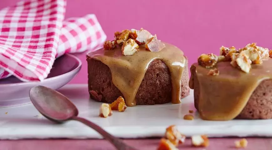 Основа держится на мягком финиковом пюре, сливочном масле и яйцах, объединённых пышной структурой теста через муку и разрыхлитель. Соус складывает в себе сладость сахара, густоту сливок и характер кофейной ноты, добираясь до лёгкой соли, которая подчёркивает вкус.