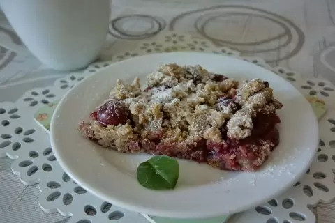 Следующий шаг — подготовка формы для выпекания. Выложите крошку равномерным слоем на дно формы, создавая основу для пирога. Затем распределите по поверхности вишню: она может быть как свежей, так и замороженной — в обоих случаях будет вкусно и очень эффектно!