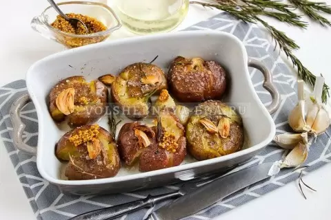 Готовую картошку подают горячей, дополненной горчицей для особого вкусового акцента. Это идеальное гарнир к мясным блюдам, птице или самостоятельно, как замечательный перекус. Простота в приготовлении и изысканность во вкусе — вот что делает это блюдо настоящим must-try!