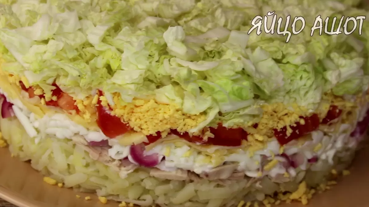 Завершаем оформление мелко нарезанным помидором и посыпаем тертыми желтками, создавая красивый контраст. Финальный штрих — тонко нарезанная пекинская капуста, добавленная сверху.