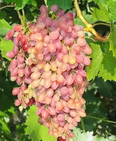 Этот сорт славится длинными гроздьями, вес которых может достигать 1000 грамм. Ягоды розово-багряного цвета, без косточек, обладают приятной сладостью (до 21%) и насыщенным мускатным ароматом. Нежная мякоть этого винограда идеально подходит как для употребления в свежем виде, так и для десертов. Благодаря прочной кожице урожай хорошо переносит транспортировку и хранение. К тому же, сорт отличается высокими показателями урожайности, хотя и требует уместной нормировки завязей.