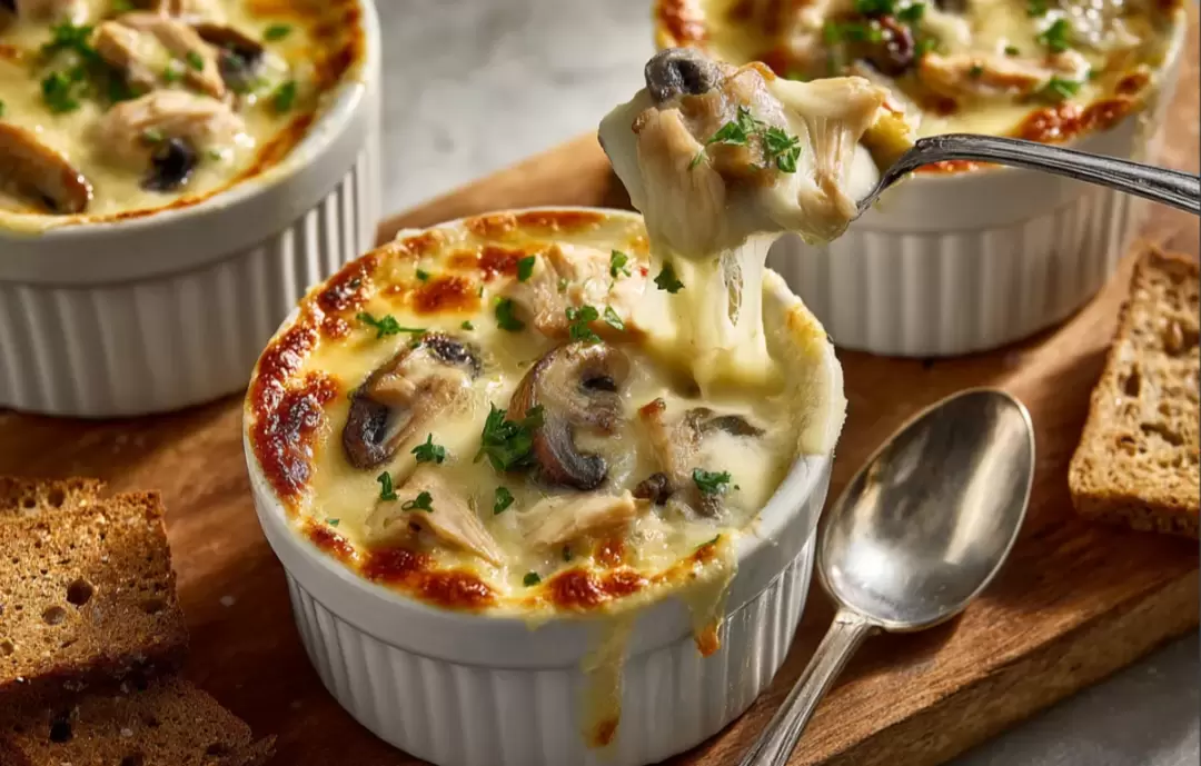 Перемешайте все ингредиенты, разложите массу по огнеупорным формочкам, обильно посыпьте сверху сыром и отправьте в духовку под верхний гриль на 6–8 минут, пока не появится золотистая корочка. В это время на сухой сковороде подрумяньте ломтики пшеничного хлеба — они прекрасно подойдут к вашей горячей закуске. Подавайте жюльен сразу же: тягучий сыр, воздушный соус и аппетитные кусочки курицы и грибов станут отличным дополнением к хрустящему хлебу.