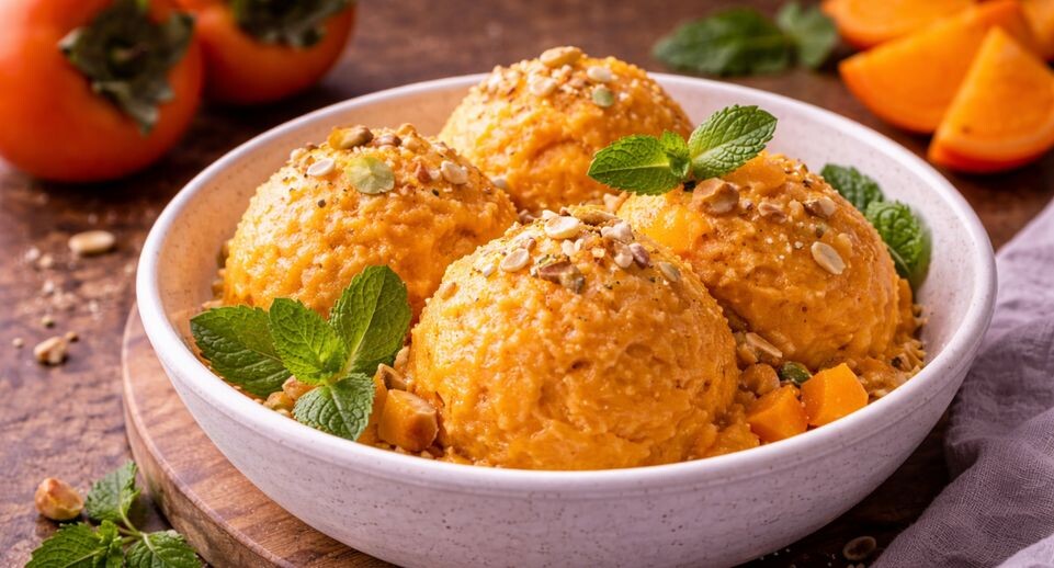 Великолепное сочетание натуральных ингредиентов делает этот десерт настоящей находкой для тех, кто следит за своим рационом. Хурма выполняет роль и натурального подсластителя, и основы, что позволяет получить великолепную текстуру и вкус.