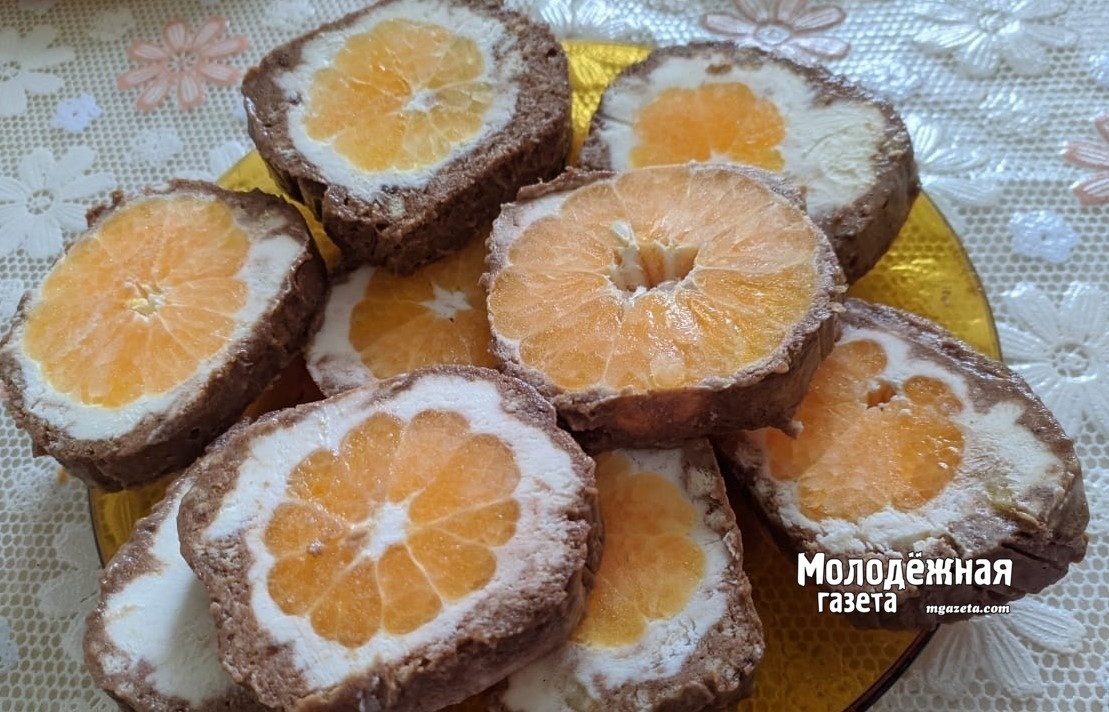 Когда сладость готова, нарежьте рулет острым ножом, чтобы соки мандаринов не разлились и не смешались с творожной массой. Приятного аппетита!