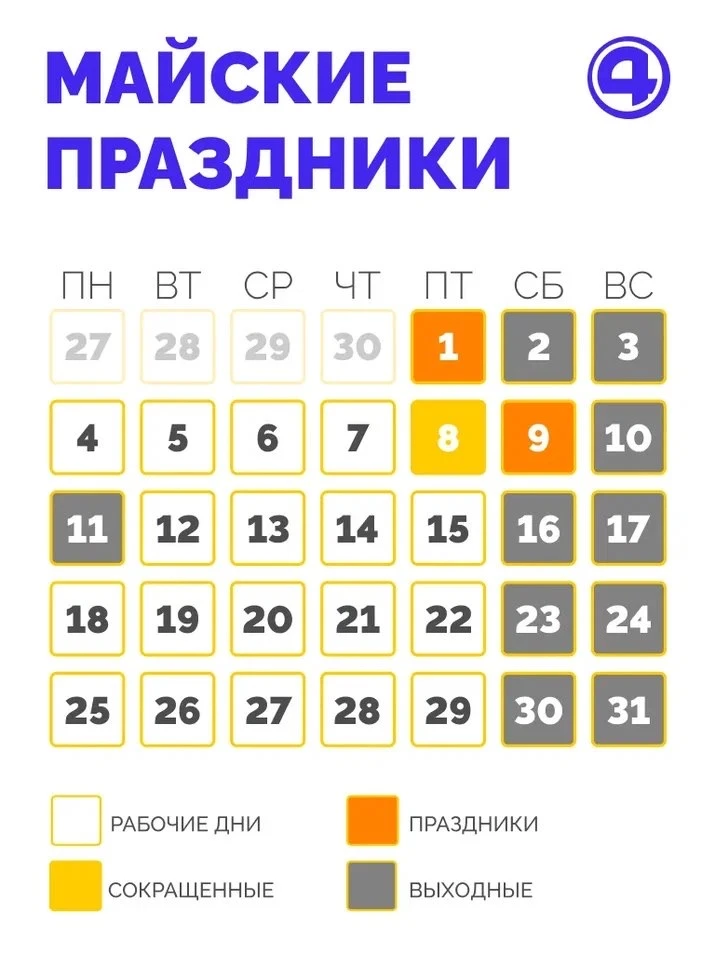Праздники в этом году щедро дарят нам две порции длинных выходных. Сначала отдыхаем с 1 по 3 мая в честь Праздника весны и труда. А потом гуляем с 9 по 11 мая — в честь Дня Победы. Между ними всего пять рабочих дней — с 4 по 8 мая, последний — сокращённый.