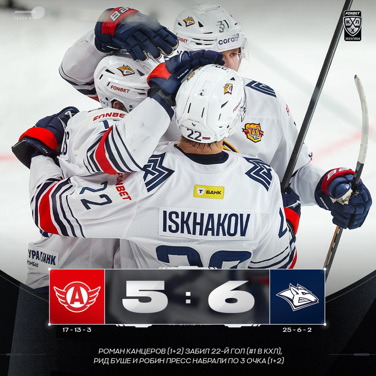 В составе победителей шайбы забросили Никита Михайлис (33-я минута), Владимир Ткачев (34), Данила Паливко (45), Роман Канцеров (46), Дмитрий Силантьев (57) и Робин Пресс (60), забивший за секунду до сирены. У проигравших отличились Джесси Блэкер (23), Брукс Мэйсек (25), Максим Осипов (31), Рид Буше (40) и Александр Шаров (52).
